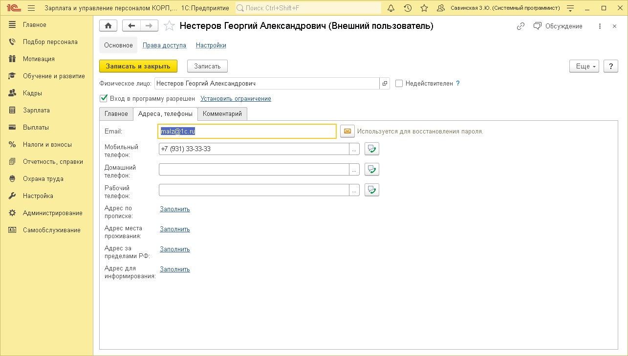Для внешнего пользователя сохраняется адрес электронной почты и телефон кандидата.