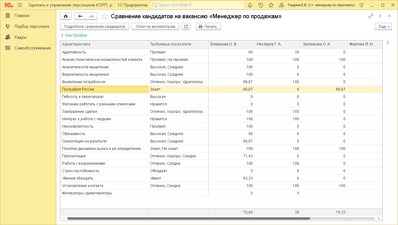 Кандидатов на вакансию можно сравнить по характеристикам между собой по результатам тестирования и электронного интервью.