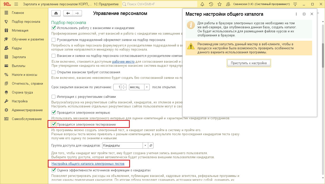 Администратор в Настройка / Управление персоналом включает опцию Проводится электронное тестирование.