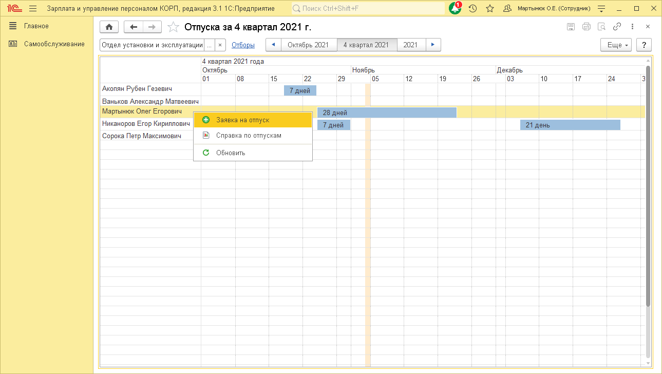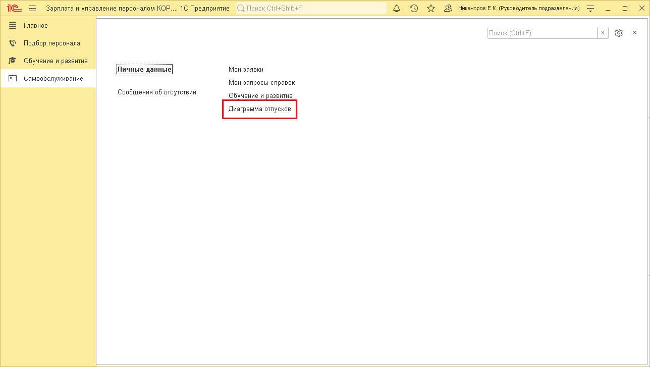 Все пользователи могут сформировать Диаграмму отпусков в разделе Самообслуживание / Диаграмма отпусков. А Кадровикам Диаграмма отпусков доступна еще в разделе Кадры / Диаграмма отпусков.