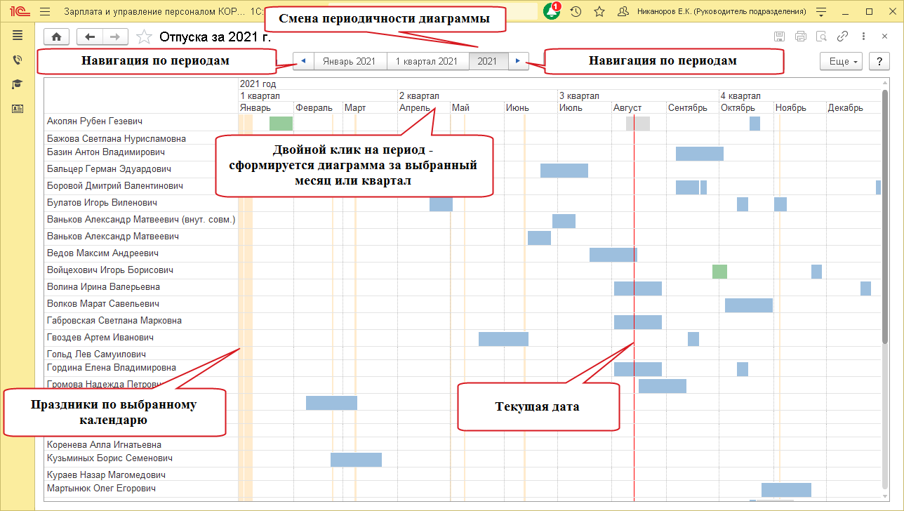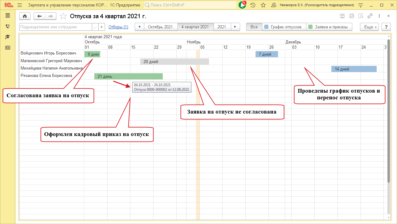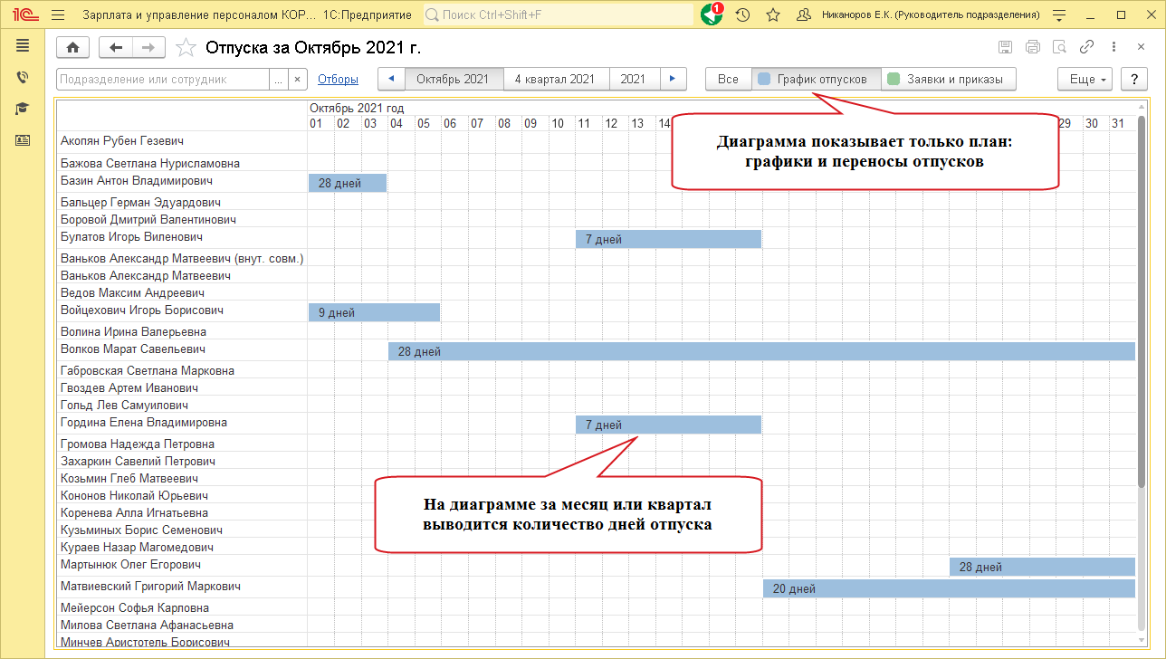 Она наглядно (разными цветовыми отрезками) показывает заявки сотрудников на отпуск, их согласование, графики отпусков, их переносы и фактическое использование этих дней.