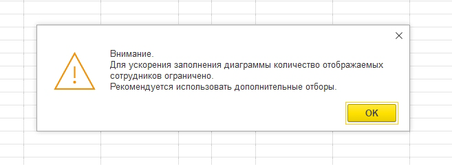 Для крупных компаний с большой численностью Диаграмму отпусков трудно анализировать. Для комфортной работы в отчете выводится список сотрудников не более 100 человек. Если сотрудников больше, программа предупреждает о необходимости использовать дополнительные отборы.