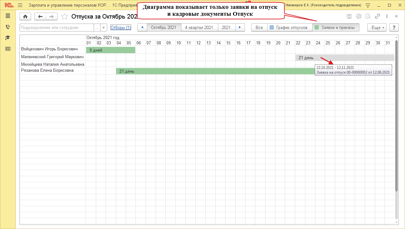 При наведении курсора на период отпуска в диаграмме всплывает подсказка с указанием документа.