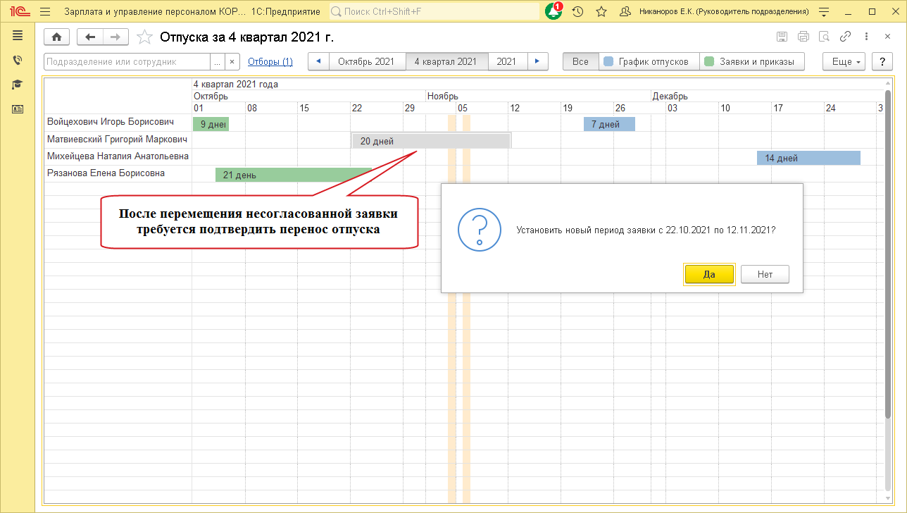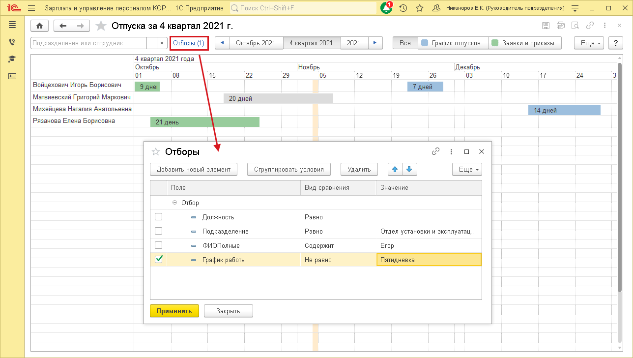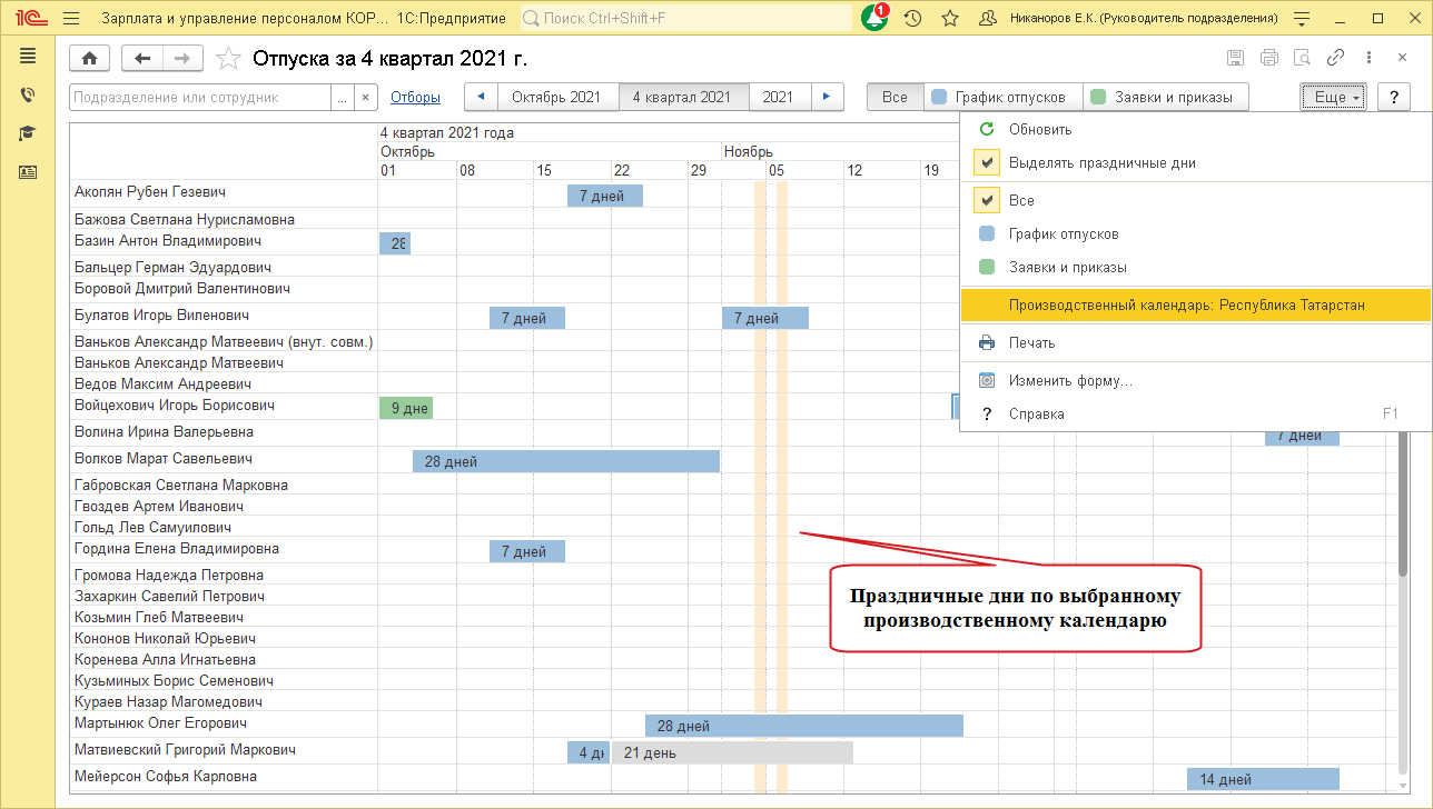 Это особенно удобно при планировании, если в компании есть сотрудники, отпуска которых не должны пересекаться или периоды, когда нельзя предоставлять отпуска.