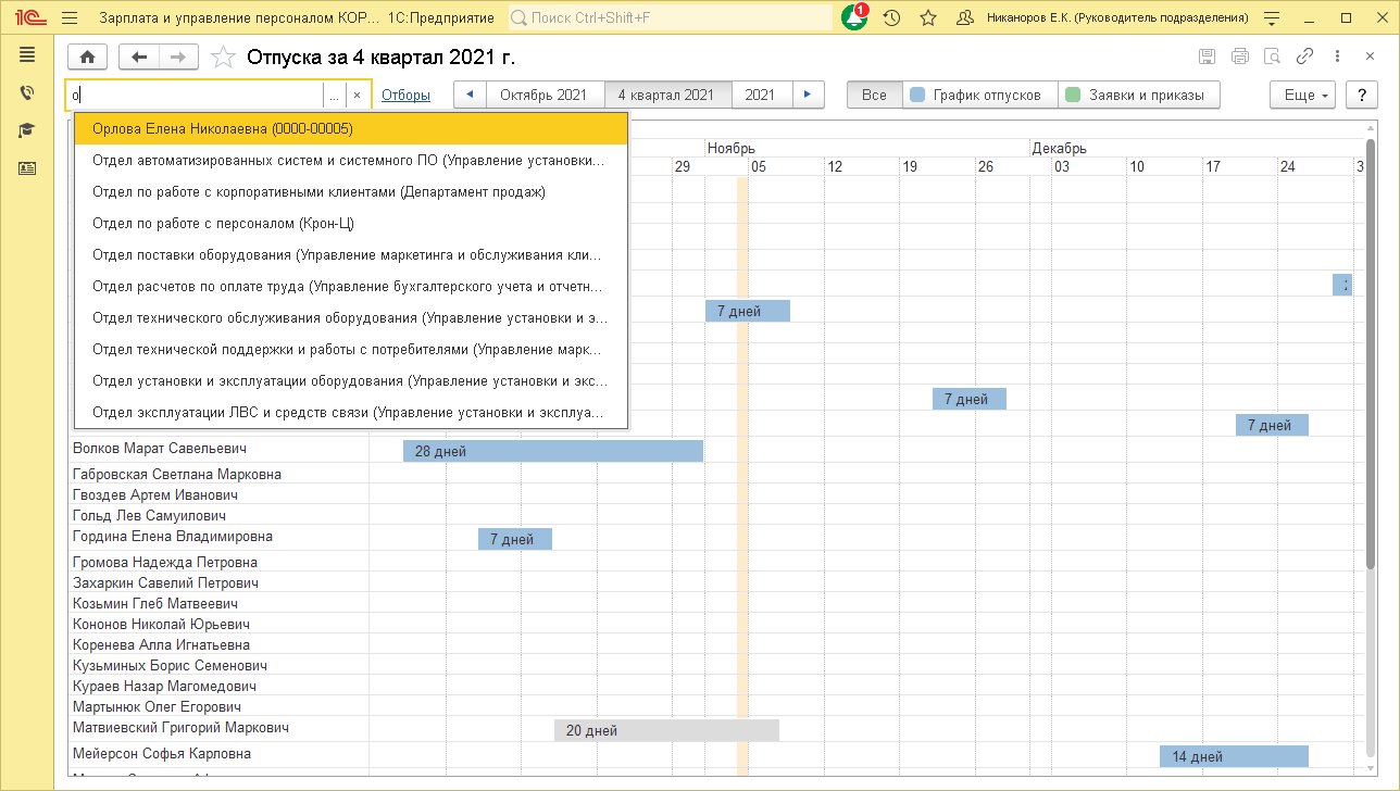 Быстрый отбор помогает найти сотрудников по начальным буквам ФИО, а подразделения - по названию.