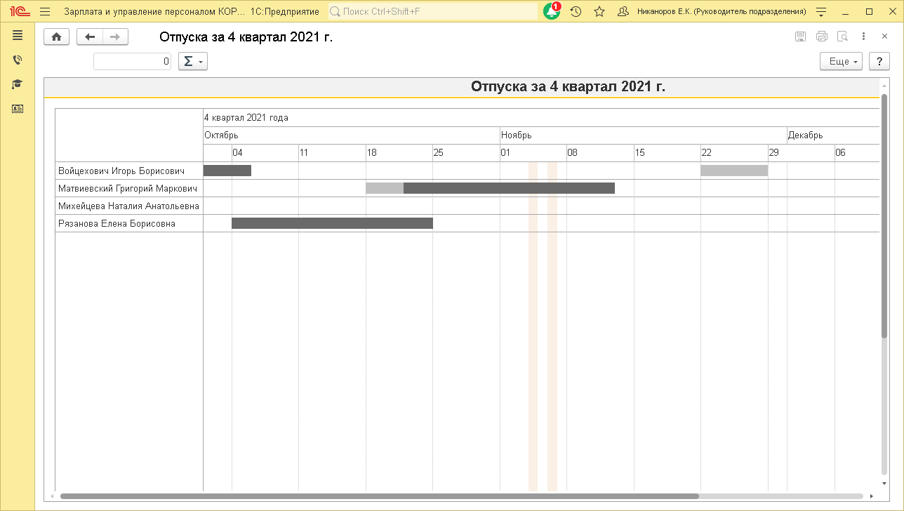 Диаграмма наглядно рисует периоды запланированных и фактических отпусков за выбранный месяц, квартал или год.