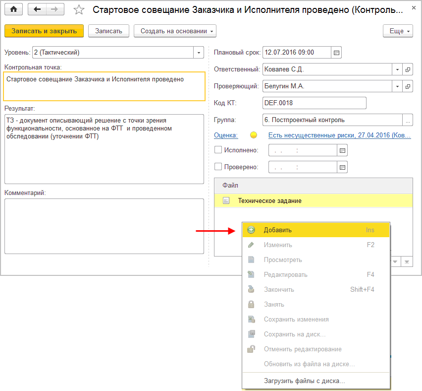 К контрольной точке теперь можно прикрепить файл. Для этого в карточке контрольной точки появился список файлов, в контекстном меню которого предусмотрена команда Добавить. Файл можно создать по шаблону, загрузить с диска или сканера.