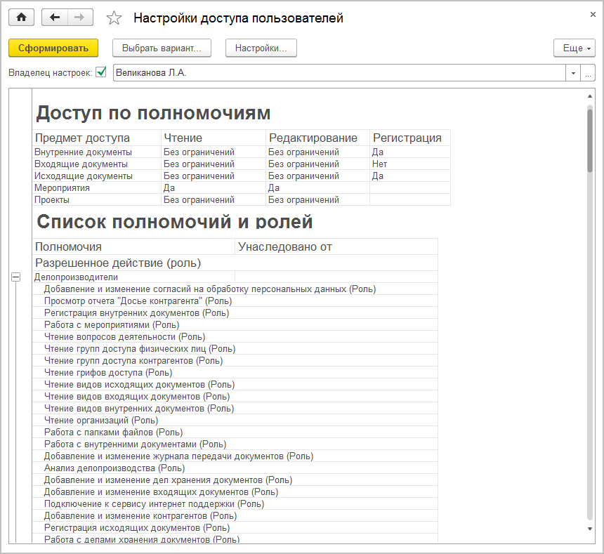 В отчете Настройки доступа пользователей теперь выводится полный список полномочий пользователя и ролей, которые им соответствуют.