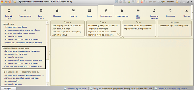 Основные документы по отражению в учете операций по выращиванию молодняка находятся в блоке меню «Птицеводство». Для того чтобы открыть список видов документов, необходимо выбрать в меню «Птицеводство» соответствующий раздел «Выращивание молодняка» (рис. 62).
