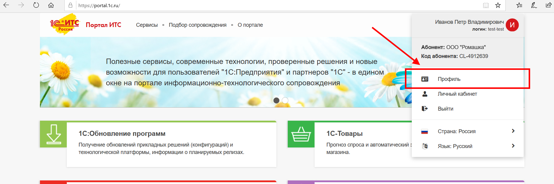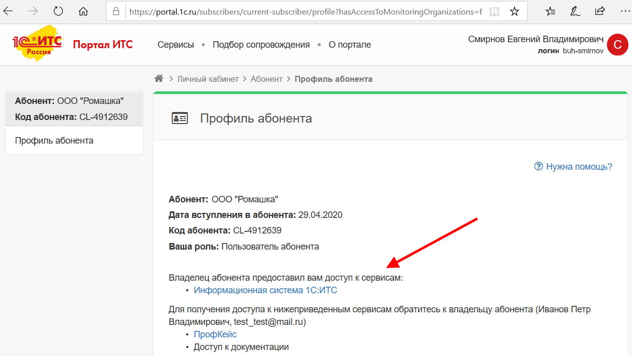 После успешной авторизации откроется Личный кабинет пользователя на Портале 1С:ИТС с подтверждением, что предоставлен доступ к Информационной системе 1С:ИТС (its.1c.ru) с логином и паролем, которые сотрудник организации придумал (или использовал, если они уже были) на этапе авторизации.