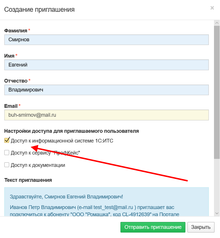 В приглашении укажите ФИО и адрес почты сотрудника организации, которому будет отправлено приглашение. Установите флаг настройки доступа к Информационной системе 1С:ИТС (можно отправить приглашение и без этого флага, а установить его потом, уже после того, как приглашение будет принято). Для отправки приглашения нажмите зеленую кнопку «Отправить приглашение».