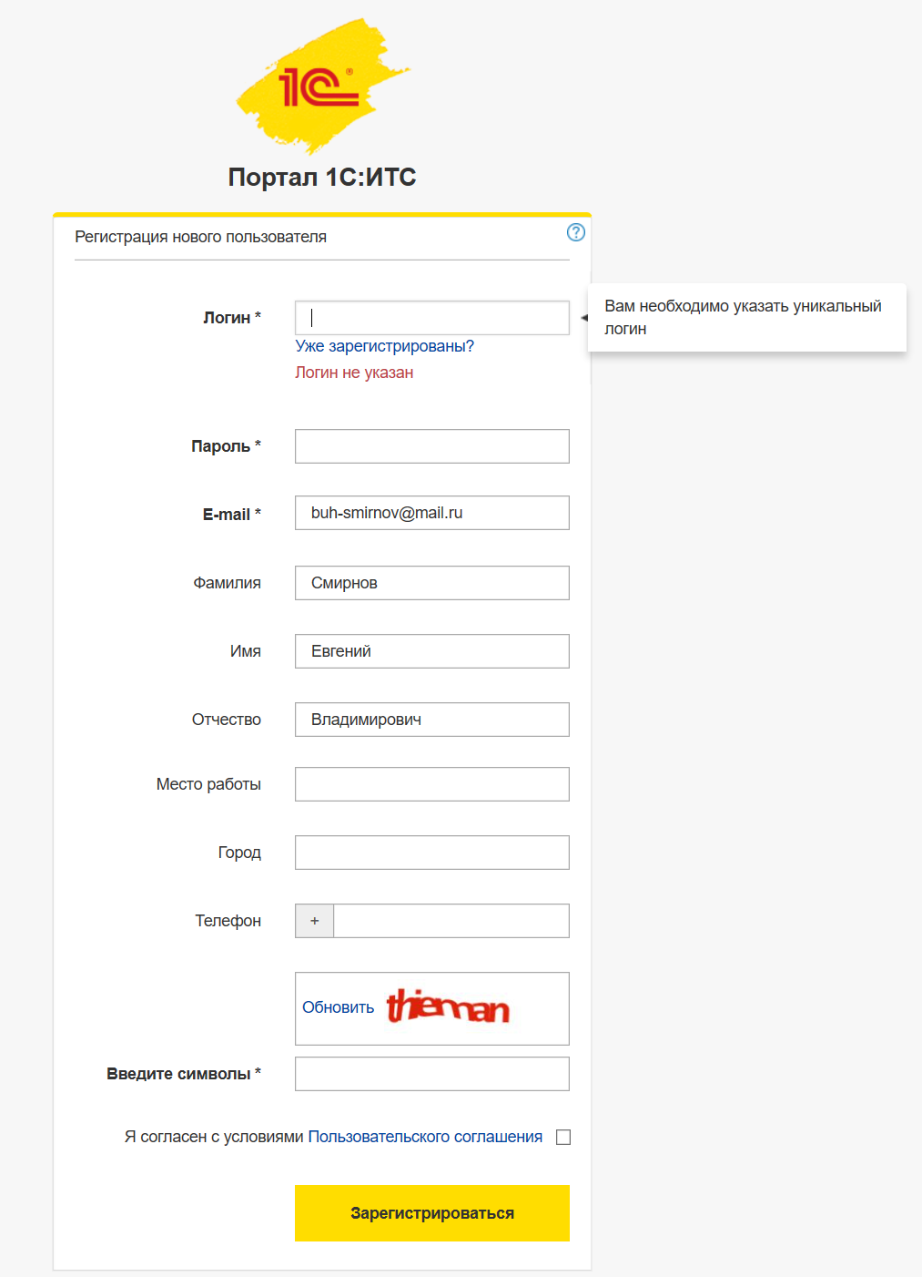 Если у сотрудника организации уже есть логин и пароль на Портале 1С:ИТС, то можно нажать ссылку «Уже зарегистрированы?» и перейти в форму ввода логина и пароля. Если логина и пароля нет, то нужно заполнить данные формы регистрации, ввести символы с картинки и нажать «Зарегистрироваться».