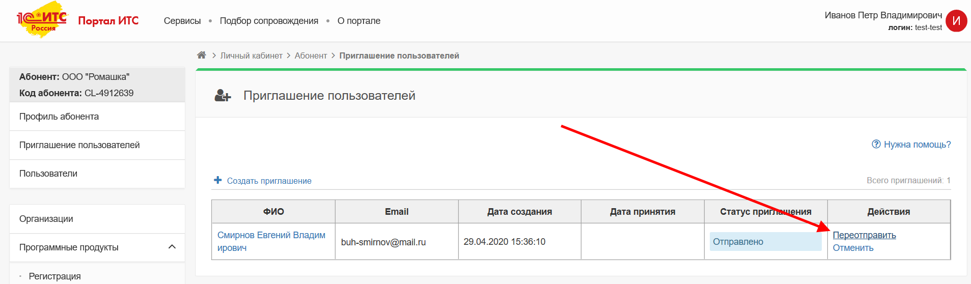 На Портале 1С:ИТС зайдите в Личный кабинет и нажмите слева пункт меню «Приглашение пользователей»