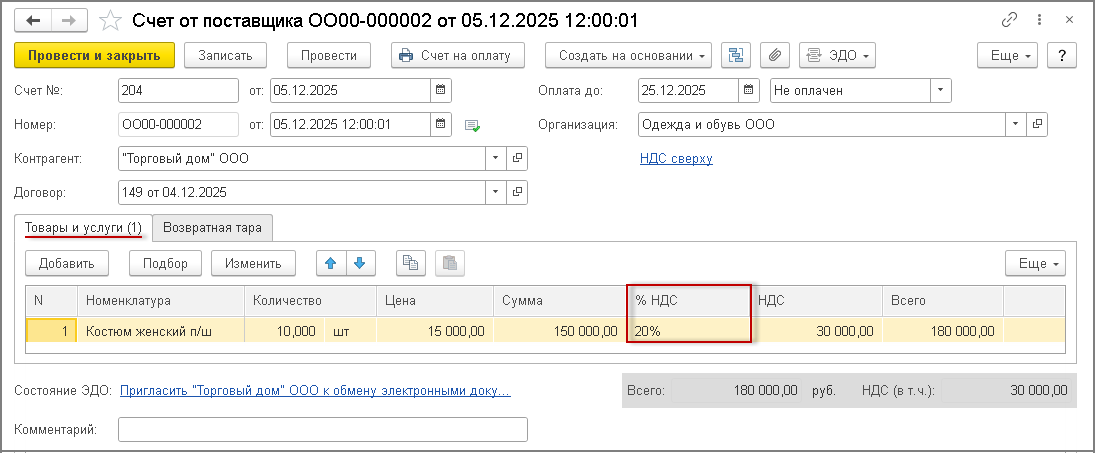 | 1.1 | 05.12.2026 | Отражение счета на оплату от поставщика | --- | --- | 180 000,00 | Счет от поставщика