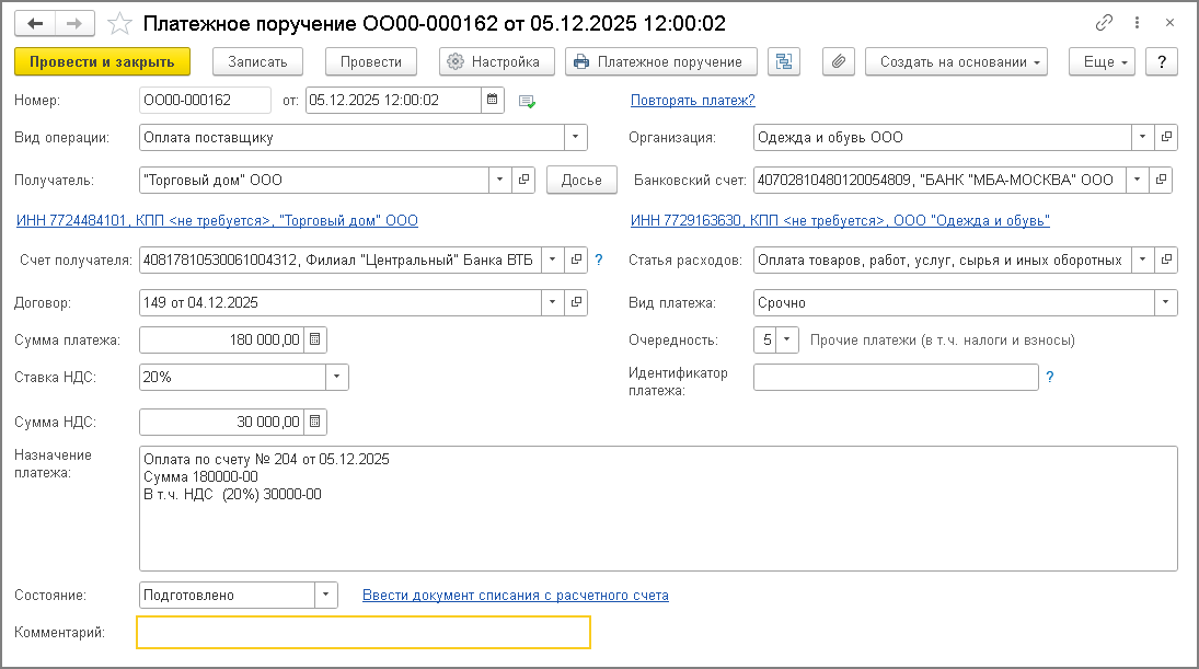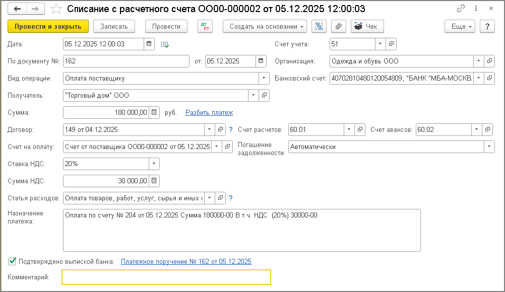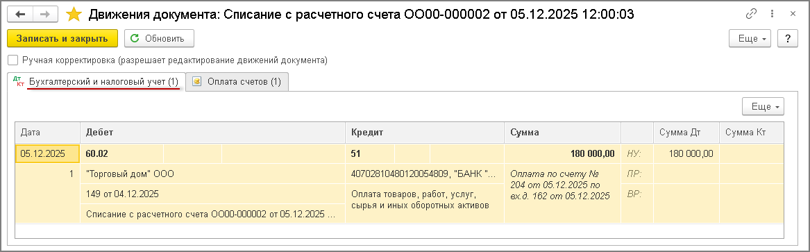 | 2.2 | 10.12.2026 | Регистрация предварительной оплаты поставщику | 60.02 | 51 | 180 000,00 | Списание с расчетного счета