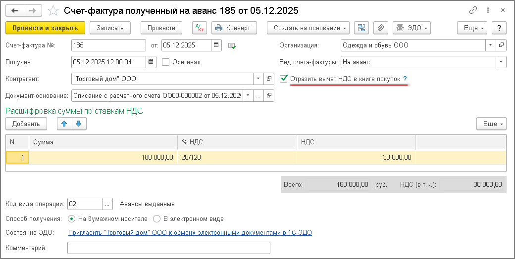 | 2.3 | 10.12.2026 | Регистрация поступившего счета-фактуры на сумму предварительной оплаты | --- | --- | 180 000,00 | Счет-фактура полученный