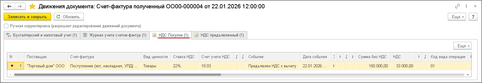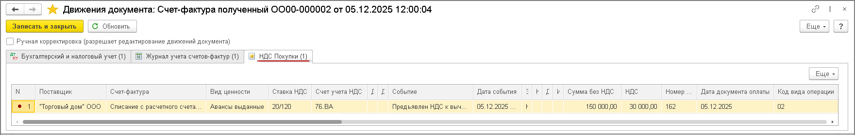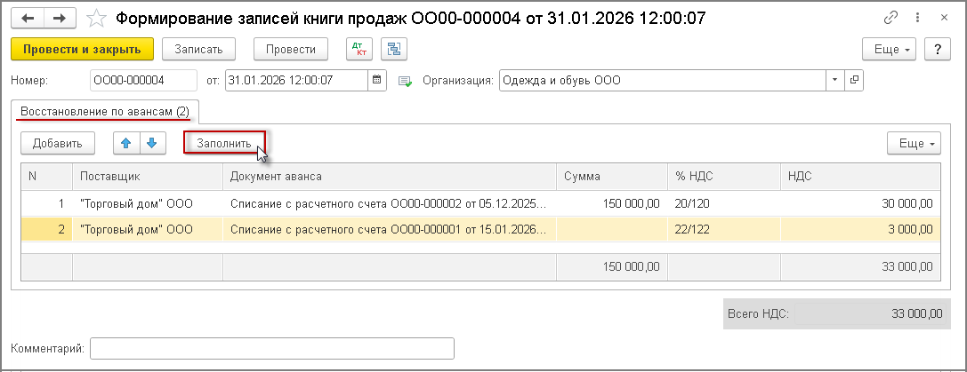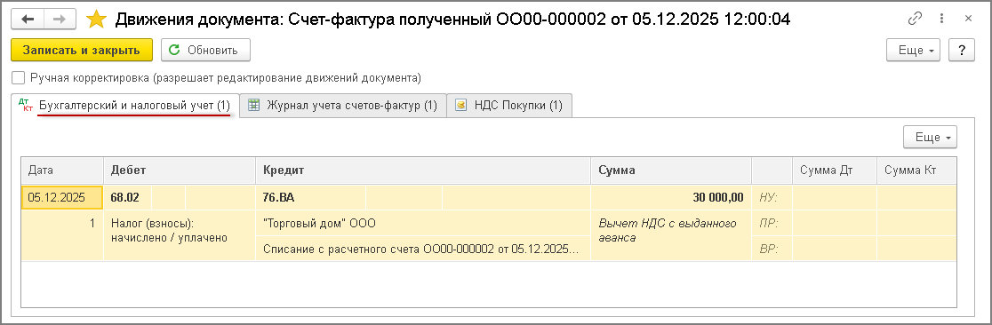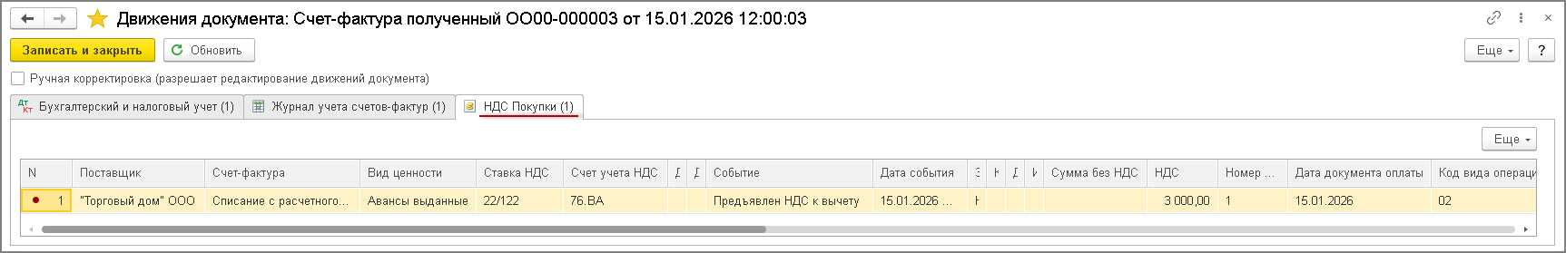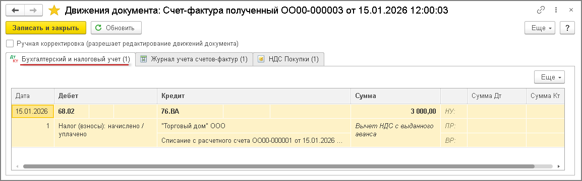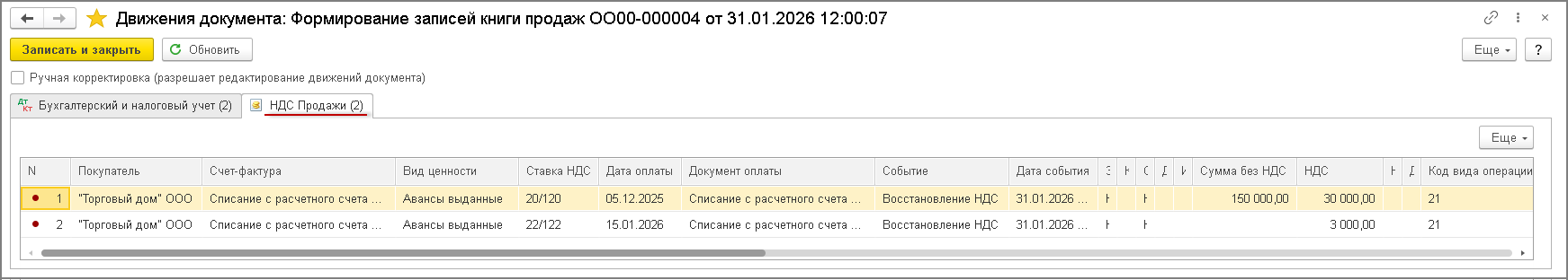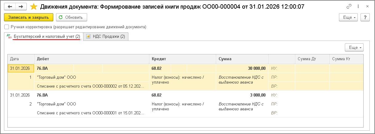 | 4.6 | 22.01.2026 | Восстановление НДС с предварительной оплаты и доплаты, зачтенных в счет оплаты поступивших товаров | 76.ВА | 68.02 | 33 000,00 | Формирование записей книги продаж | ||