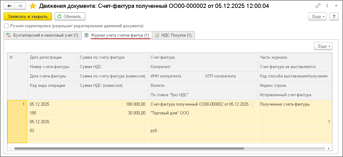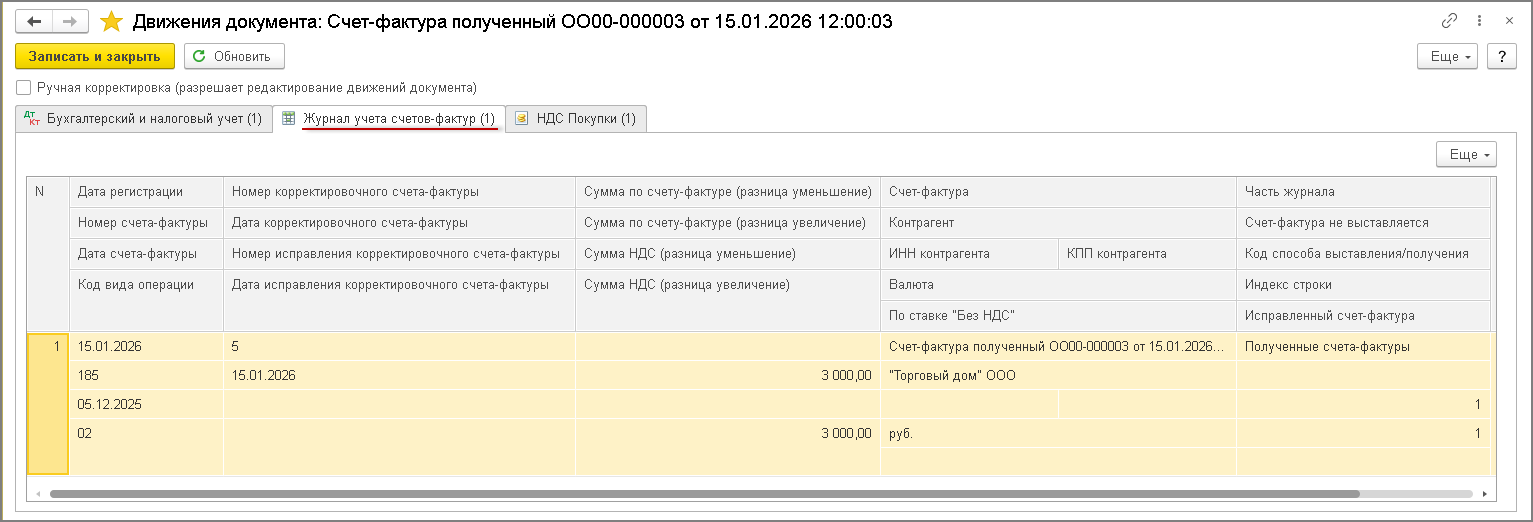 Также будет внесена запись в регистр "Журнал учета счетов-фактур" для хранения необходимой информации о полученном корректировочном счете-фактуре (рис. 15).