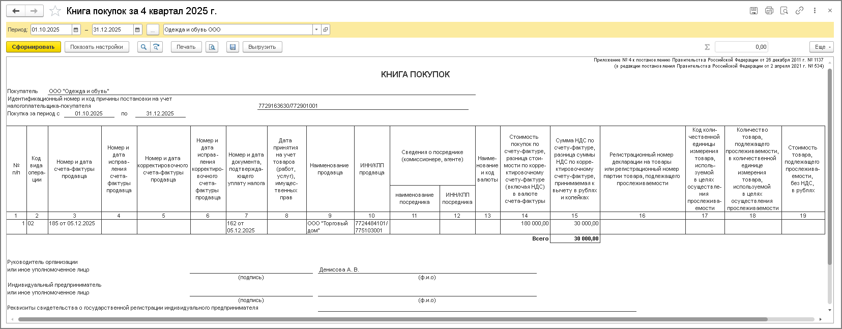 На основании записей регистра "НДС Покупки" формируется книга покупок за 4 квартал 2025 года (раздел Покупки - подраздел НДС) (рис. 9).
