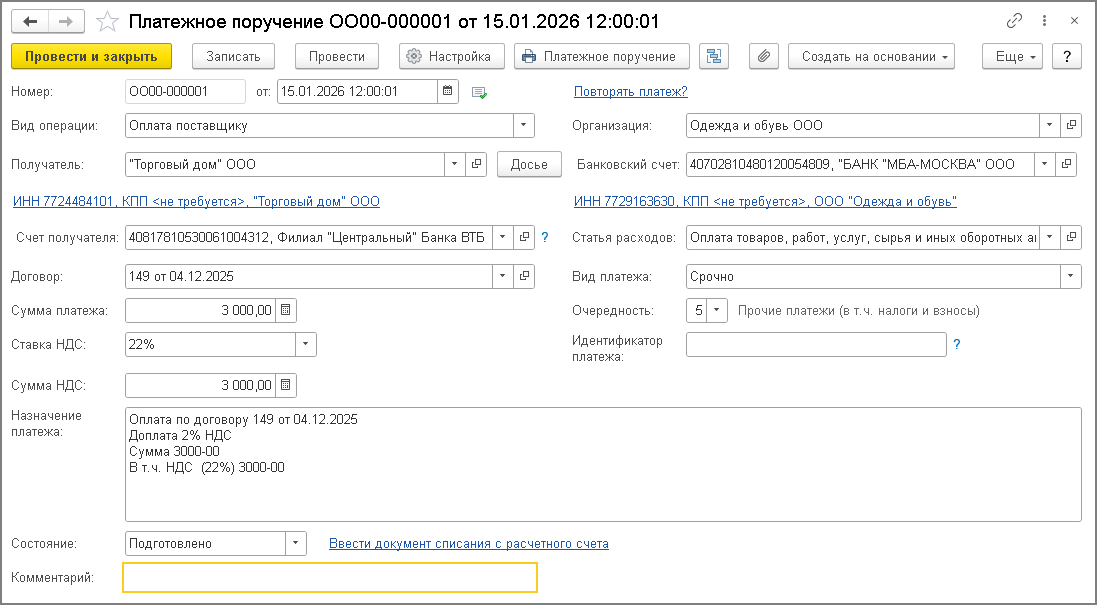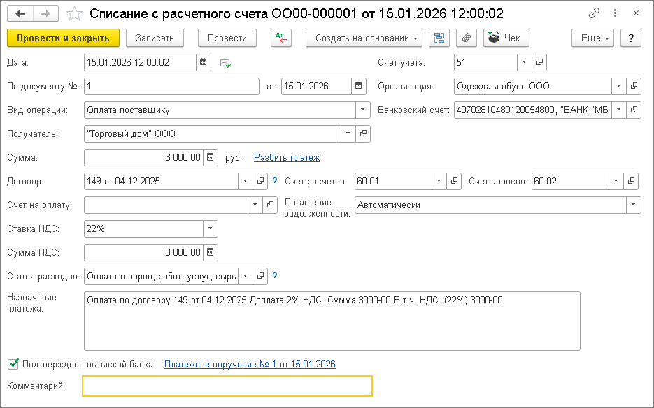 | 3.2 | 15.01.2026 | Регистрация доплаты поставщику | 60.02 | 51 | 3 000,00 | Списание с расчетного счета