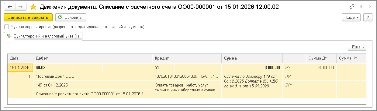 В результате проведения документа "Списание с расчетного счета" будет сформирована бухгалтерская проводка по дебету счета 60.02 и кредиту счета 51 на сумму перечисленной поставщику доплаты 2% НДС в размере 3 000,00 руб. (рис. 12).