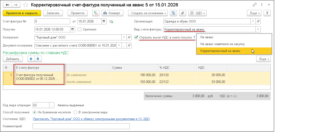 | 3.3 | 15.01.2026 | Регистрация поступившего корректировочного счета-фактуры на сумму доплаты | --- | --- | 3 000,00 | Корректировочный счет-фактура полученный