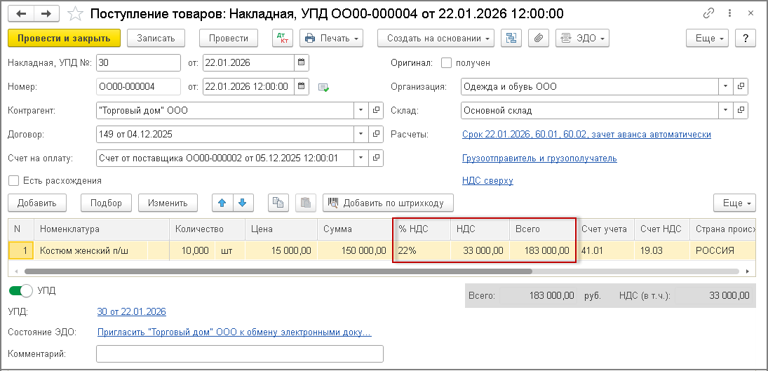 документа "Поступление (акт, накладная, УПД)"; - по гиперссылке Все реквизиты формы "Универсальный передаточный документ", которая открывается по гиперссылке строки УПД (в данном случае - по гиперссылке 30 от 22.01.2026) документа "Поступление (акт, накладная, УПД)".