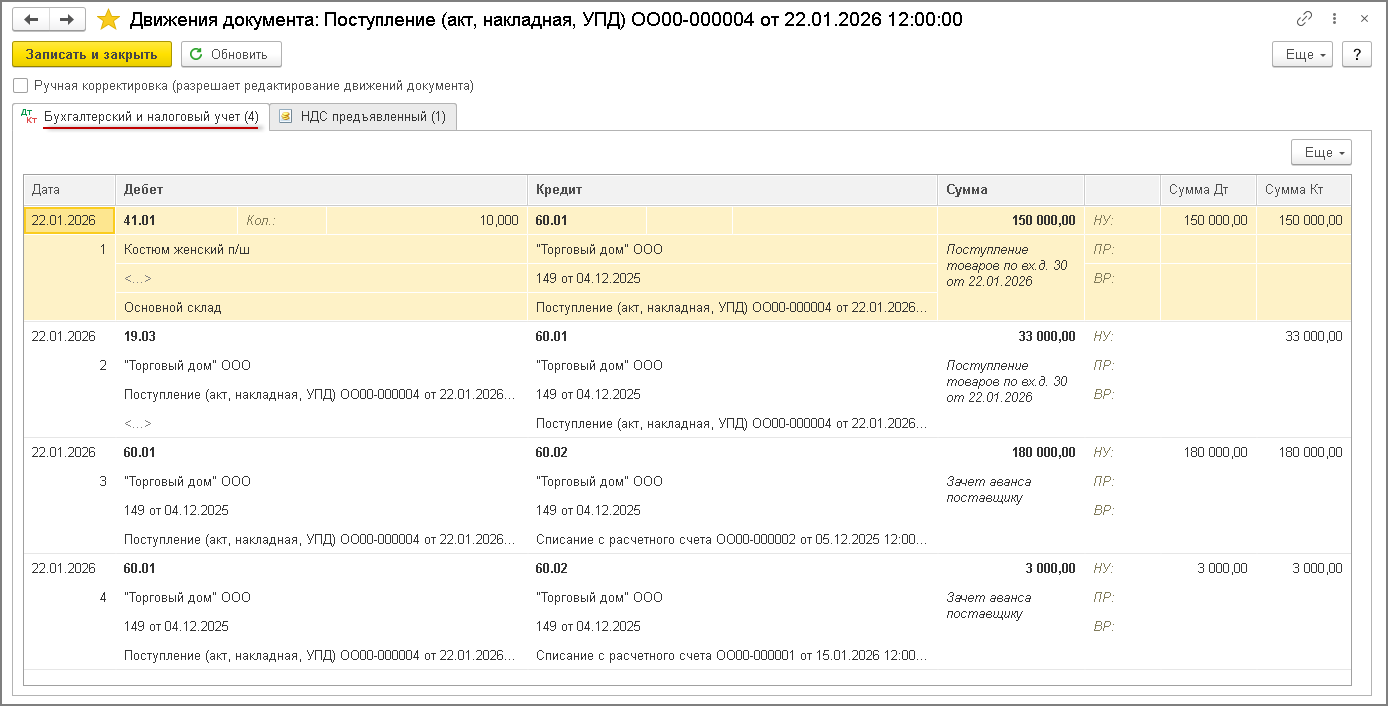 | 4.1 | 22.01.2026 | Учет поступивших товаров | 41.01 | 60.01 | 150 000,00 | Поступление (акт, накладная, УПД)