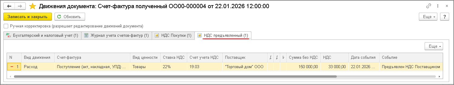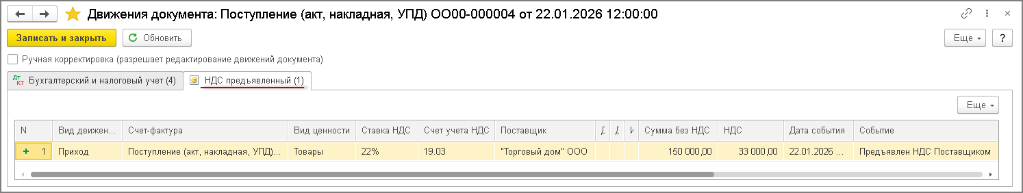 В регистр накопления "НДС предъявленный" вносится запись с видом движения "Приход" и событием "Предъявлен НДС поставщиком" (рис. 19).