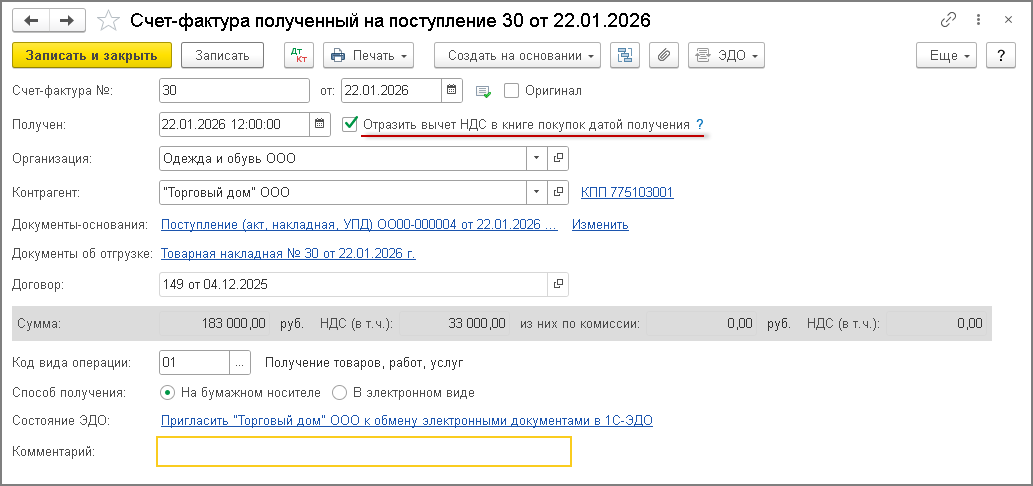 - в поле "Получен" проставлена дата регистрации документа "Поступление (акт, накладная, УПД)", которую при необходимости следует заменить на дату фактического получения счета-фактуры. Если с продавцом заключено соглашение об обмене счетами-фактурами в электронной форме, то в поле будет проставлена дата отправки файла электронного счета-фактуры оператором ЭДО, указанная в его подтверждении;