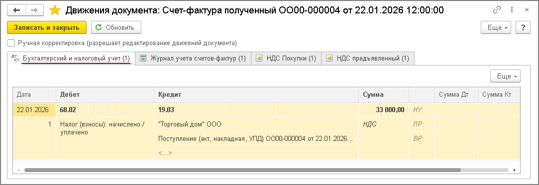 | 4.5 | 22.01.2026 | Вычет входного НДС по поступившим товарам | 68.02 | 19.03 | 33 000,00 | |||