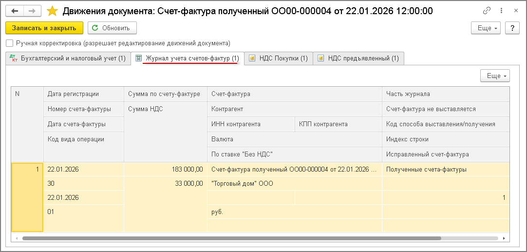 | 4.4 | 22.01.2026 | Регистрация поступившего счета-фактуры на товары | --- | --- | 183 000,00 | Счет-фактура полученный