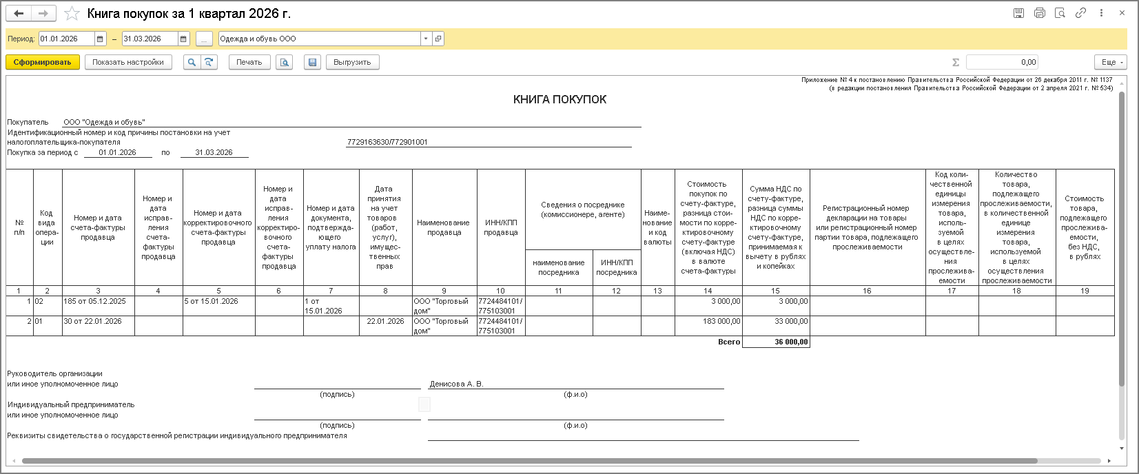 На основании записей регистра "НДС Покупки" формируется книга покупок за 1 квартал 2026 года (раздел Покупки - подраздел НДС) (рис. 25).