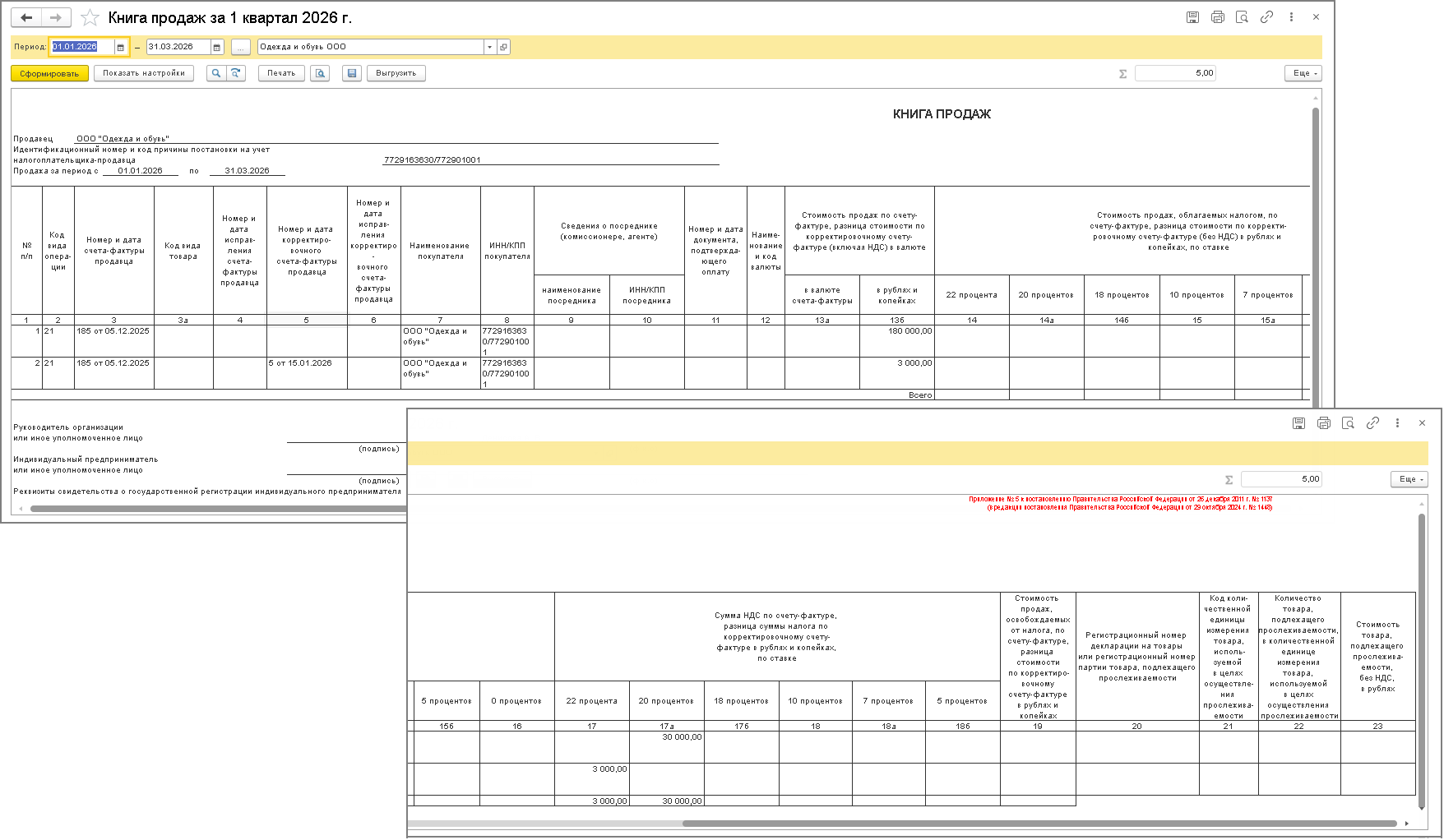 На основании записей регистра "НДС Продажи" формируется книга продаж за 1 квартал 2026 года (раздел Продажи - подраздел НДС) (рис. 29).