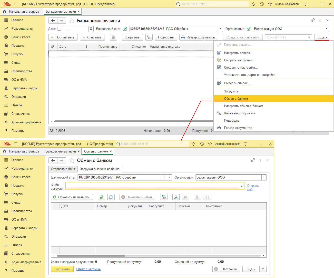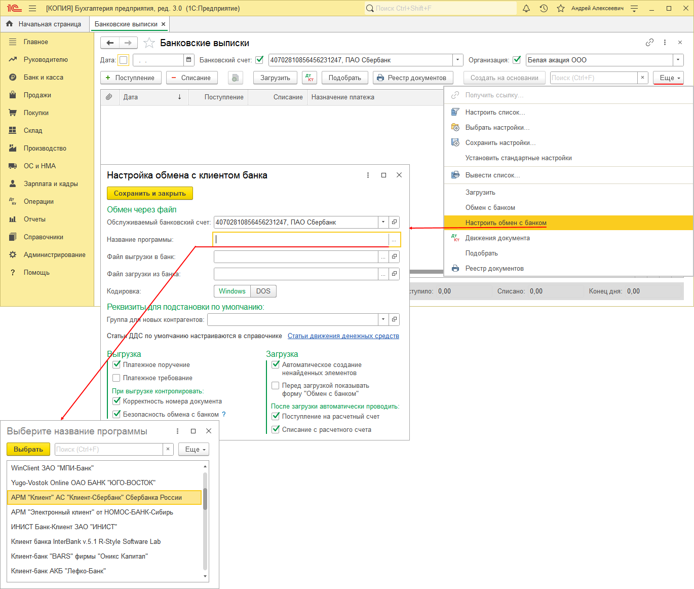 - По кнопке "Еще" выберите "Настроить обмен с банком". В открывшемся окне "Настройка обмена с