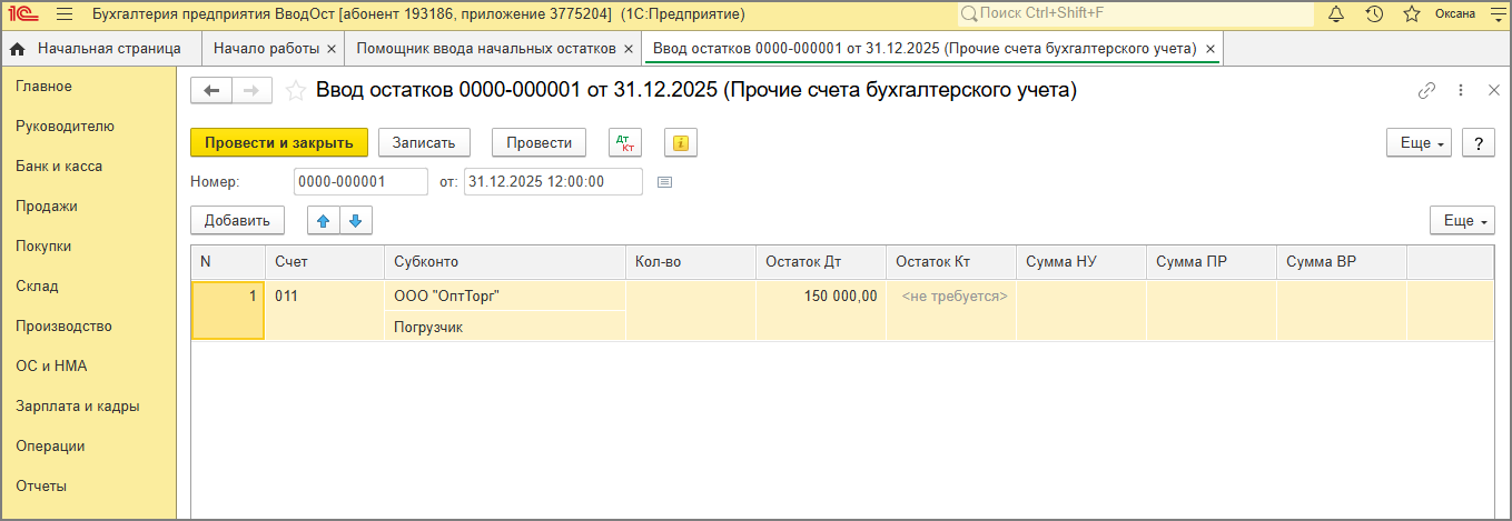 Перед вводом остатков проверьте, что установлена дата ввода остатков в одноименной ссылке. Подробнее о "Помощнике ввода остатков", установке даты и принципах ввода остатков см. здесь.