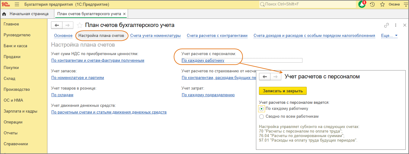 - настройку учета расчетов с персоналом в Плане счетов – учет расчетов по каждому сотруднику или сводно по всем (рис. 1);