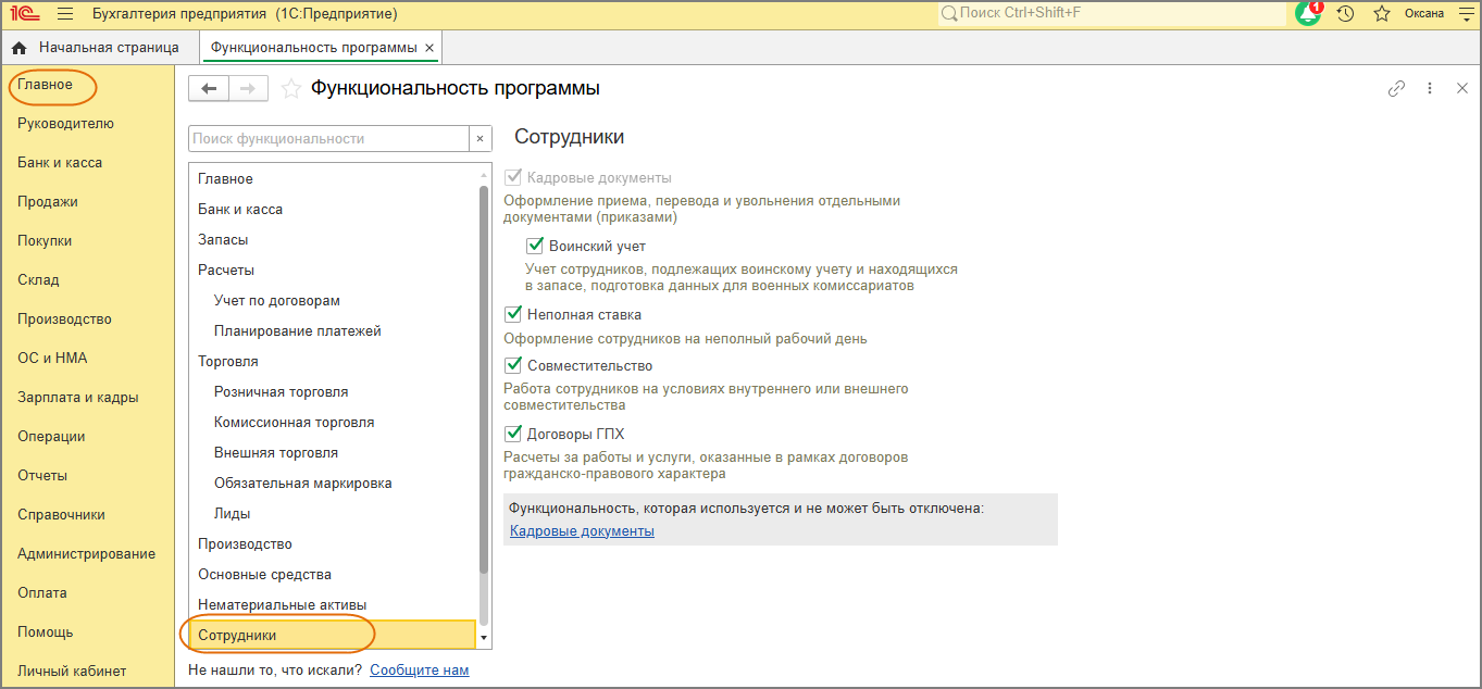 - Настройка полного кадрового учета доступна после добавления в справочник "Сотрудники" первого сотрудника.