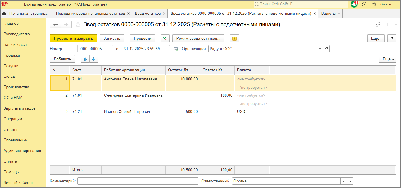 • если остатки вводятся по счету 71.21, то в колонке "Валюта" выберите наименование валюты и сумму в валюте (отображается только валюта, которая есть в справочнике "Валюты").