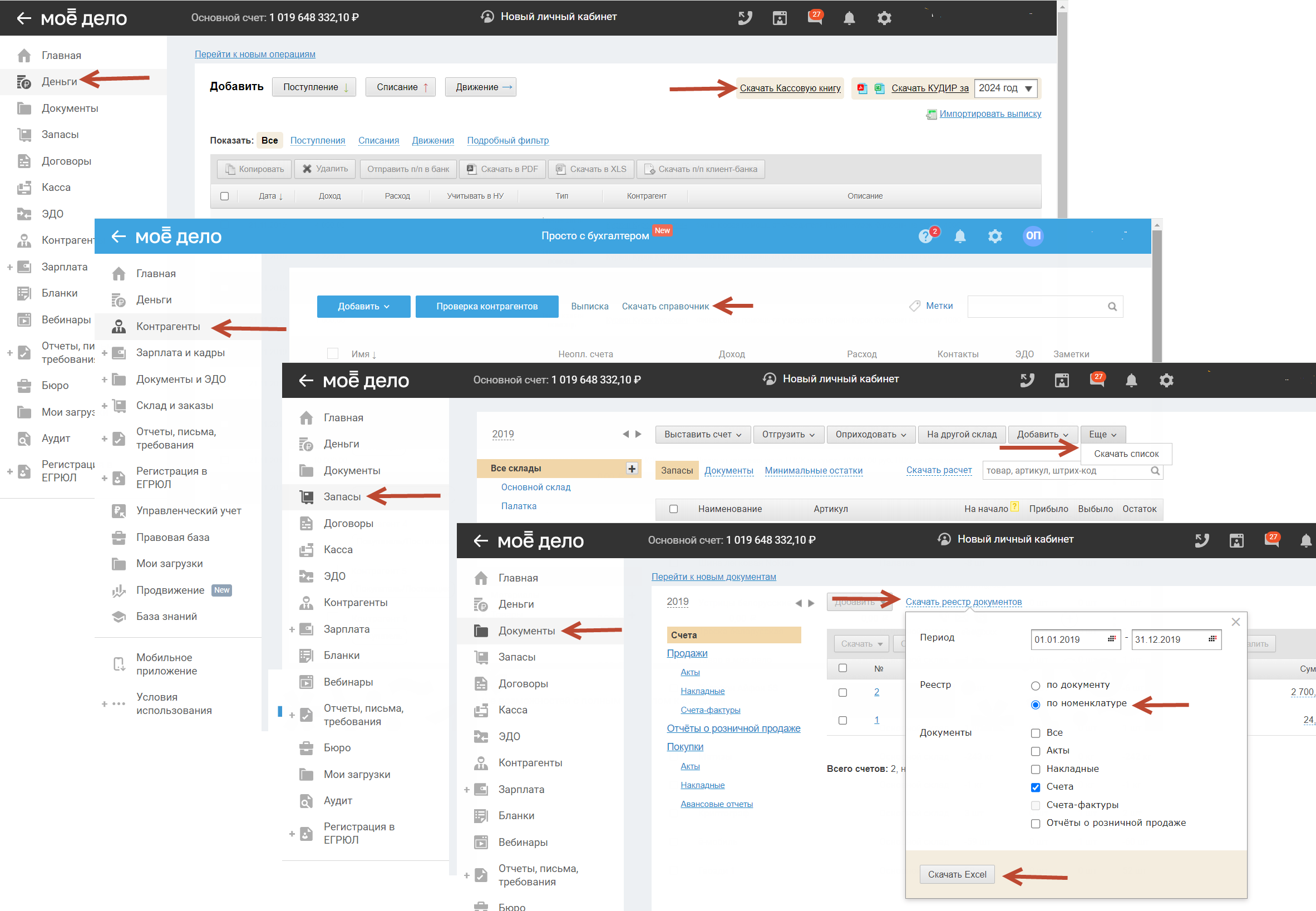 - документы движения денежных средств (раздел Деньги – Скачать кассовую книгу).