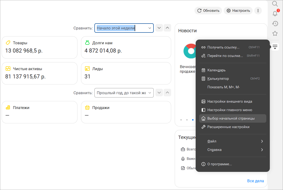 При запуске программ "1С:Розница" и "1С:Управление нашей фирмой" отображается начальная страница – рабочий стол со всей важной информацией. Состав начальной страницы и её внешний вид пользователь может настраивать для себя самостоятельно.