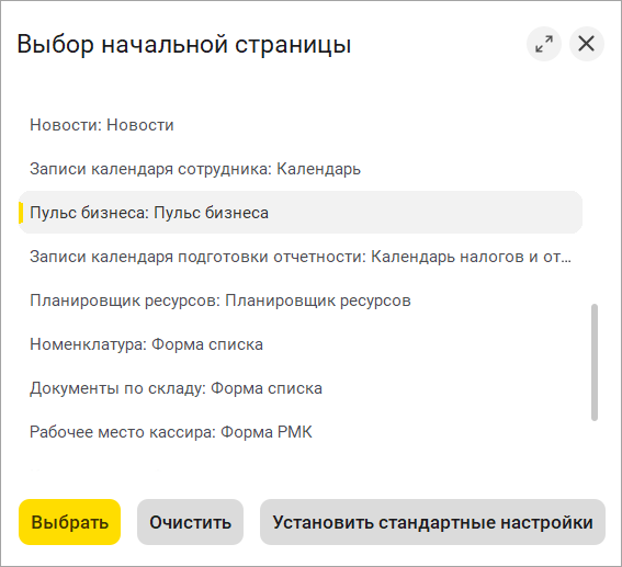 - Форма настройки состоит из окна со списком данных, которые можно вывести на рабочий стол (рис. 2). При нажатии кнопки "Очистить" на экран будет выведено лого 1С:УНФ с предложением выбрать вариант начальной страницы. При выборе кнопки "Установить стандартные настройки" отображение будет зависеть от роли пользователя: например, для менеджера – список продаж, для кассира – рабочее место кассира, и так далее. В списке также можно выбрать один из предложенных вариантов по своему усмотрению. Например, при выборе варианта "Пульс бизнеса" на начальной странице будут отображаться показатели, текущие дела, динамика продаж и структура списания денег. Карточки можно настроить под себя по кнопке "Настроить".