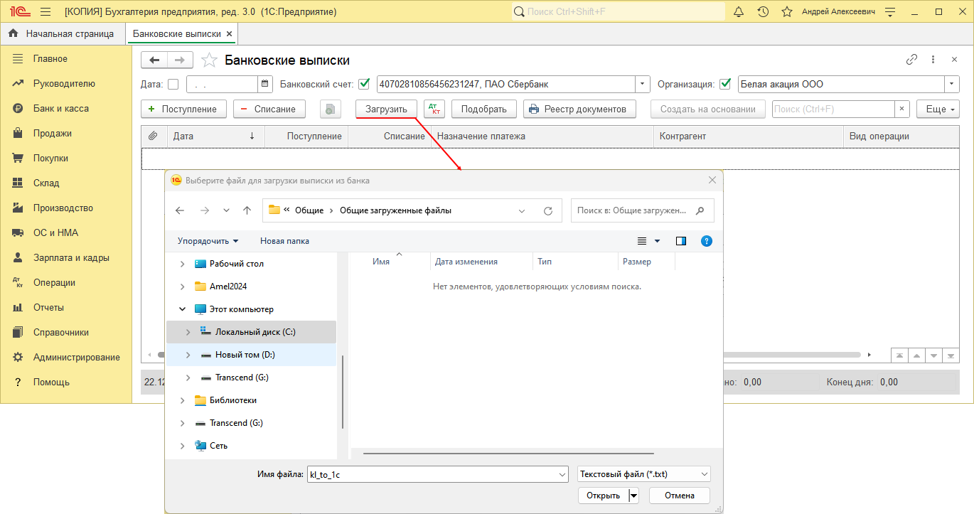 • в поле "Файл загрузки из банка" укажите расположение файла kl_to_1c.txt (файл создается автоматически) для загрузки данных из "Клиент-банка";