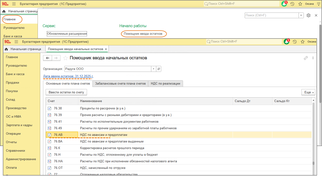 - Раздел Главное - Помощник ввода остатков.