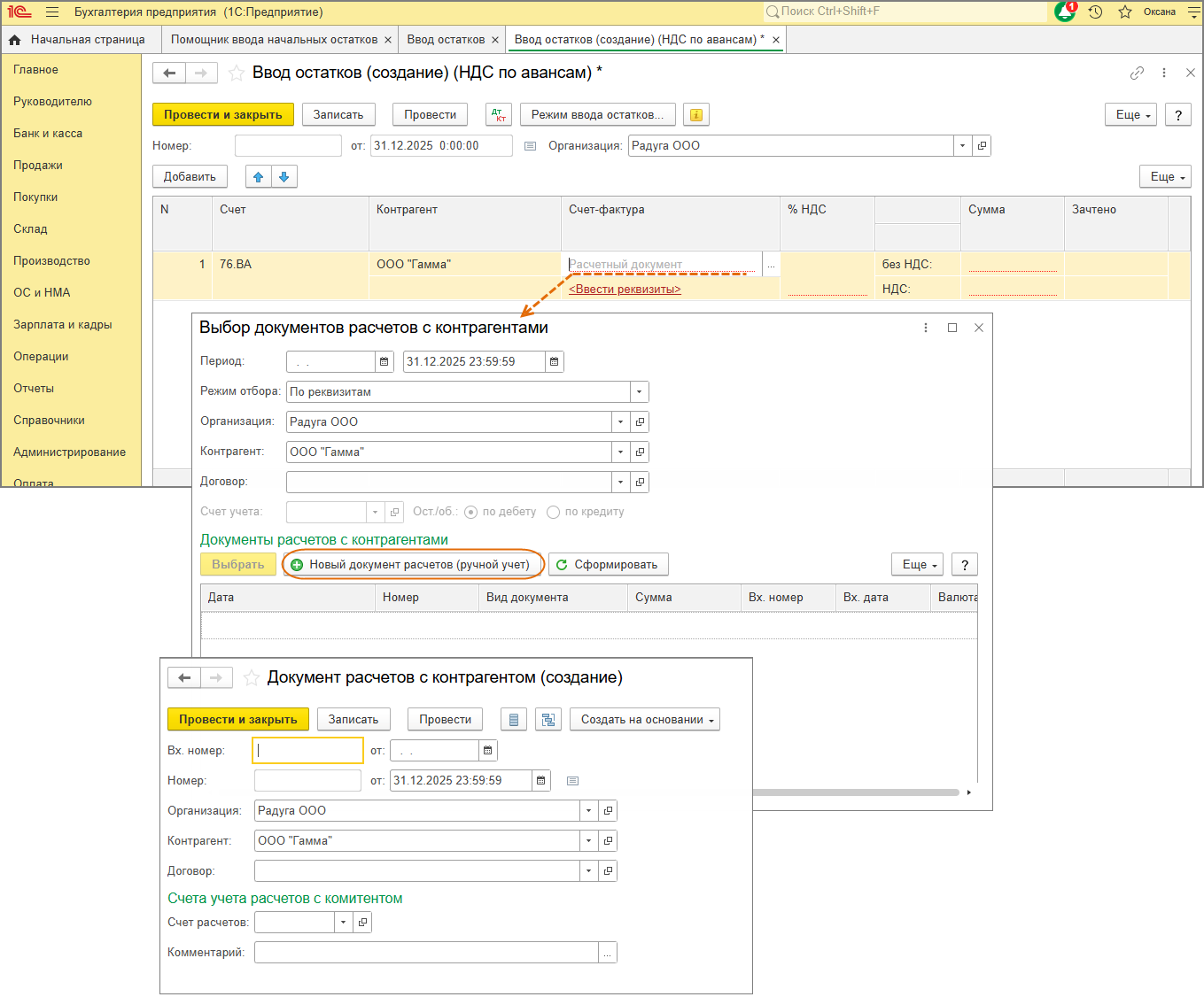 - в первой строке в открывшейся форме "Выбор документов расчетов с контрагентами" создайте новый вспомогательный документ по кнопке "Новый документ расчетов (ручной учет)" и выберите его (документ не формирует проводки) (рис. 2);