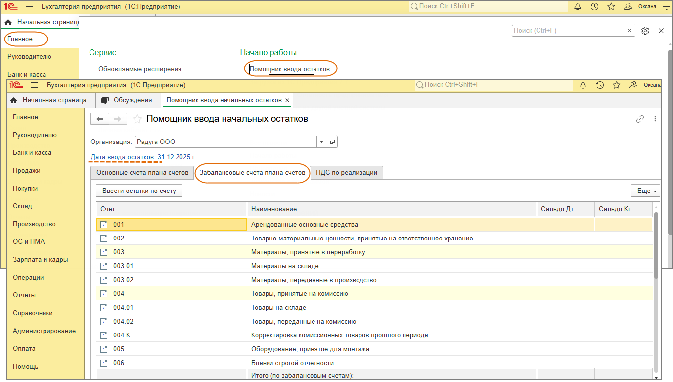 Начальные остатки по забалансовым счетам вводятся по разделу "Прочие счета бухгалтерского учета" и отображаются на закладке "Забалансовые счета плана счетов".