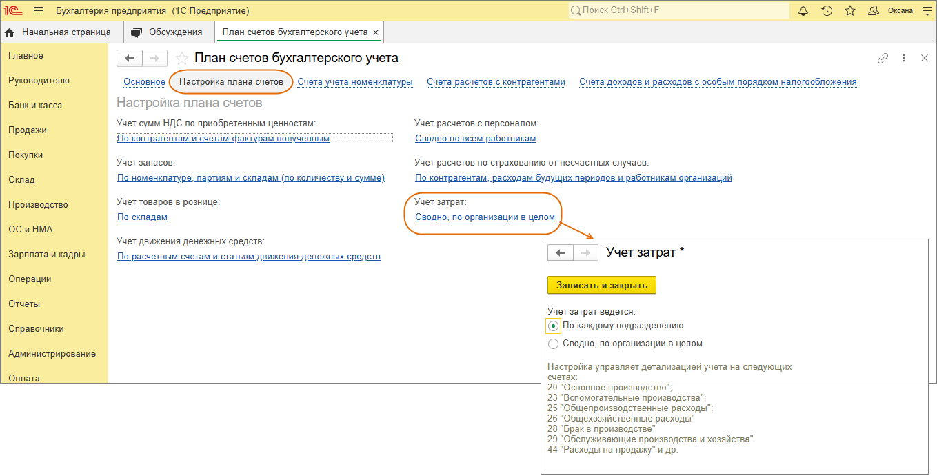 - Перейдите по ссылке "Настройка плана счетов". По ссылке в группе "Учет затрат" установите переключатель в положение "По каждому подразделению".