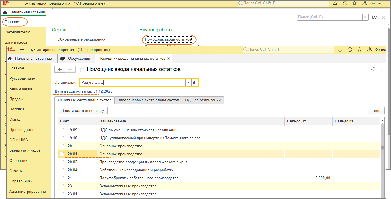 - Раздел Главное – Помощник ввода остатков.