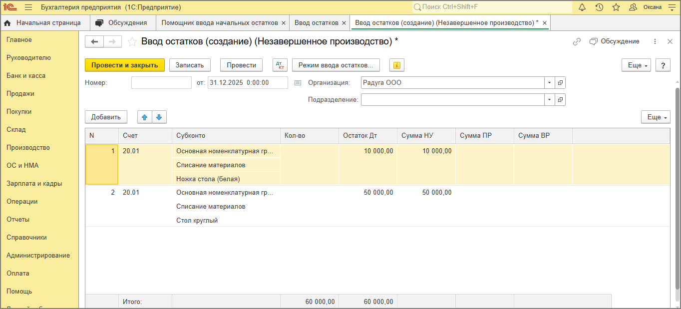 - Аналогичным образом по кнопке "Добавить" введите остатки по остальным номенклатурным группам, статьям затрат, продукции (работам, услугам) незавершенного производства, счетам (субсчетам).
