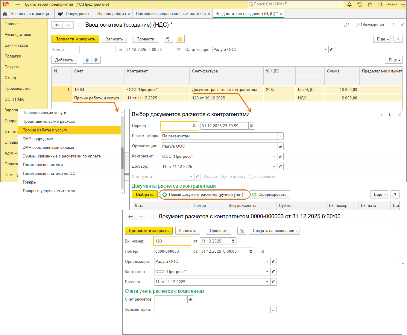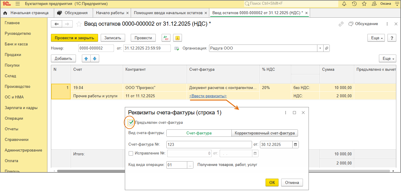 - в соответствующих колонках выберите ставку НДС и укажите суммы остатка.